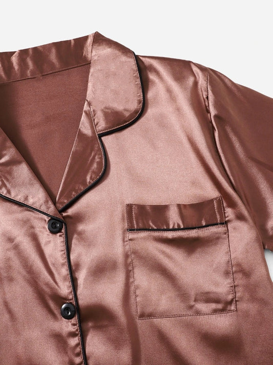 Bella de Fashion Finds Women’s Contrast Pipping Satin Short PJ Set /Nightdress Silky/ Night Suit For Women’s SBA-SS-255-RUST-BROWN