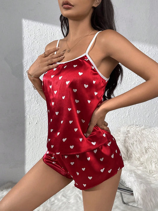Rachel Lingerie Store Elegant Touches Women Heart Print Cami Top & Shorts Satin Cami Set