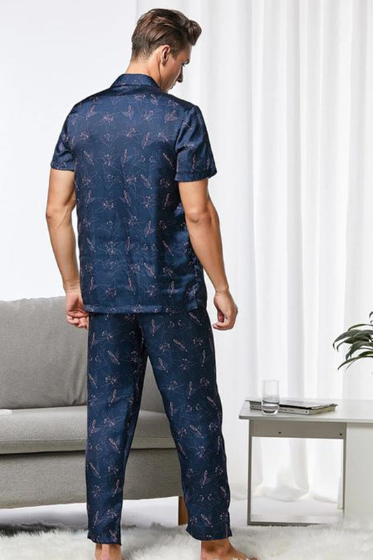 Sebastian Men's Silky Satin Navy Floral Print pajama set pjs, satin, Half sleeve