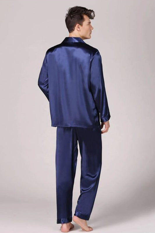 Sebastian Men's Silky Satin Navy lapel collar button front satin pj set