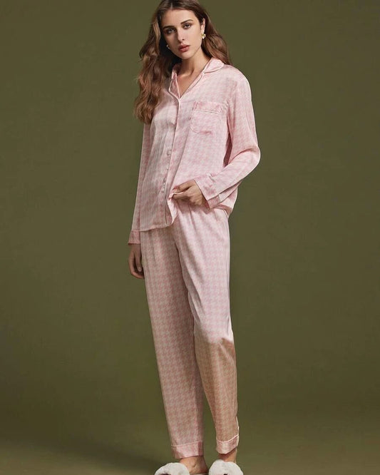 She's Inn Trendy Picks Silky Satin Pink Checkered Contract Pippin Satin PJ Set