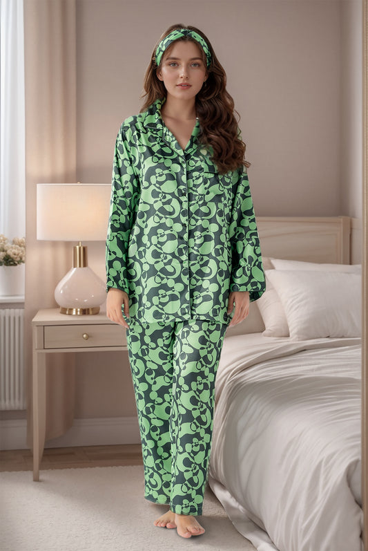 Rue' Rofe' Luxe Nightwear & Casual Daily Wear women Green Leaf printed silky Finish night wear Pajama Set