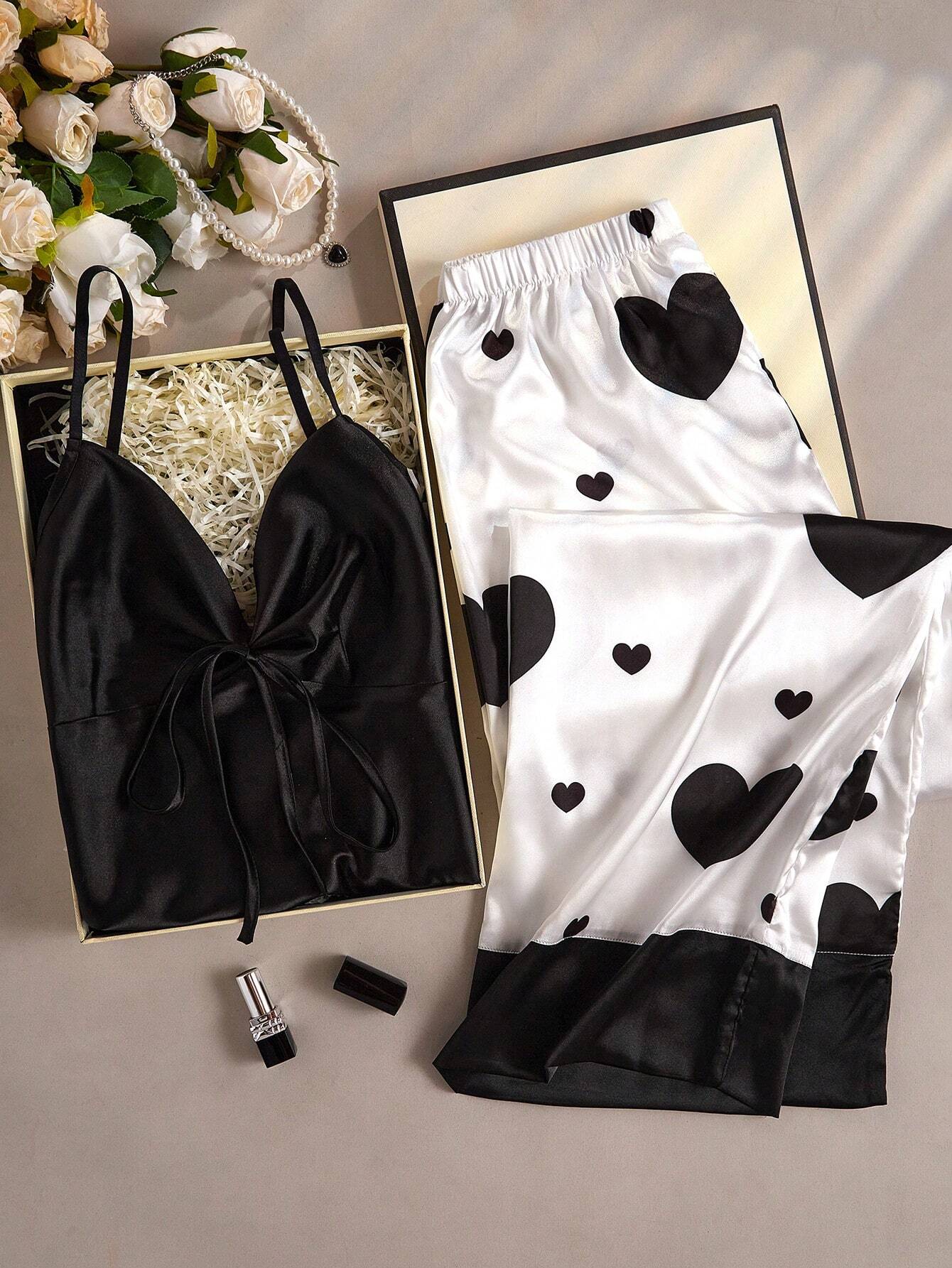 She's Inn Black heart Print Satin Camisole And Long Pants Pajama Set