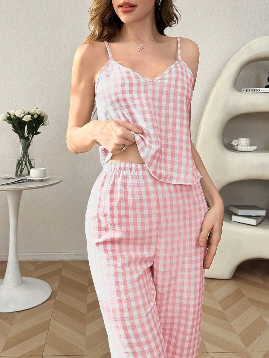 She's Inn Checkered Print Satin Camisole And Long Pants Pajama Set