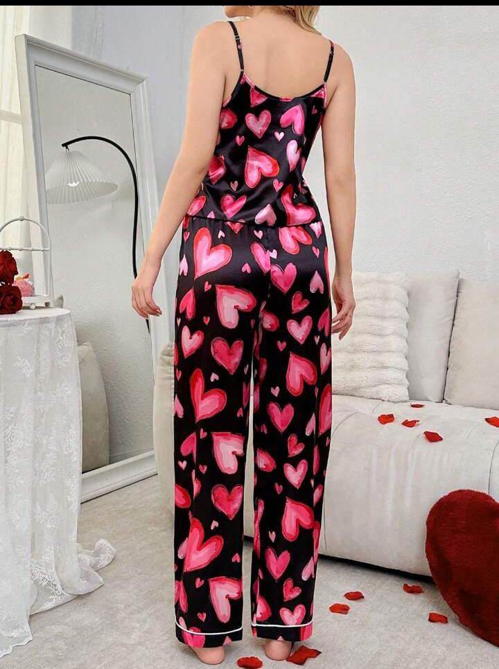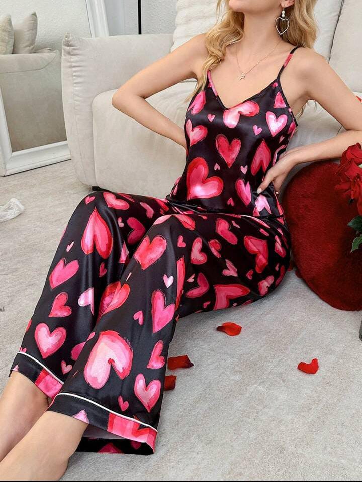 This elegant pajama set combines comfort and style, featuring a beautiful heart print camisole and long pants. Crafted from satin fabric, this set provides a luxurious feel while ensuring a soft and breathable experience, perfect for a good night's sleep or relaxing at home.