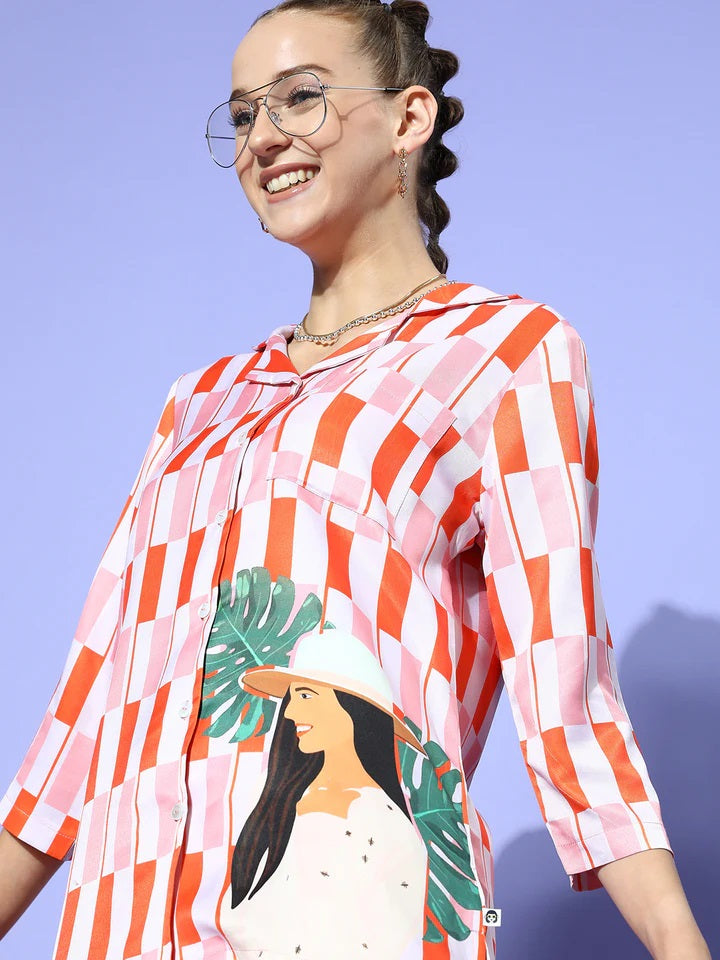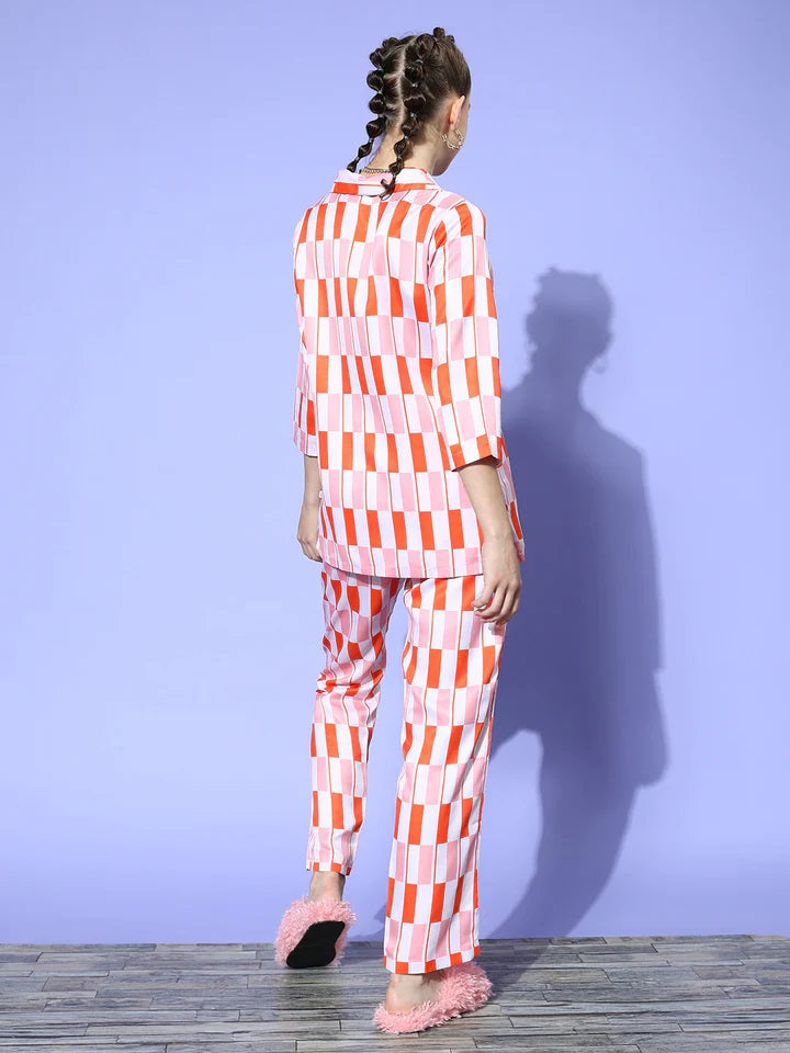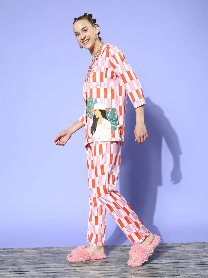 Enter the world of chic designs, unconventional prints, and bold colors. This pink conversational night suit is a blend of stunning designs and meets the latest fashion.