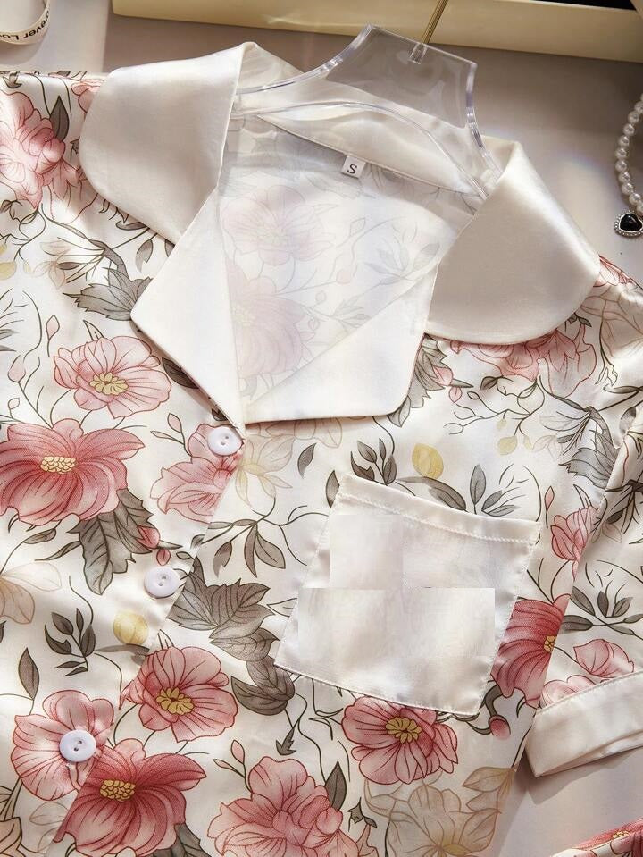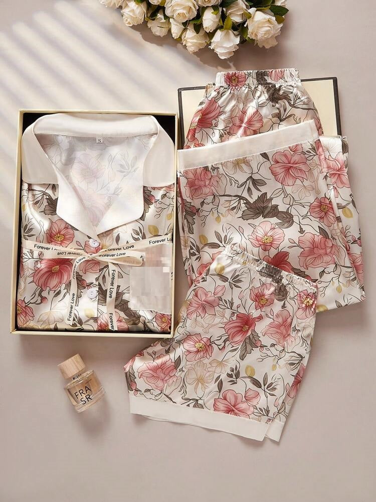 floral print, Short Sleeve shirt, pants, with short, 3 piece, satin pj set for women