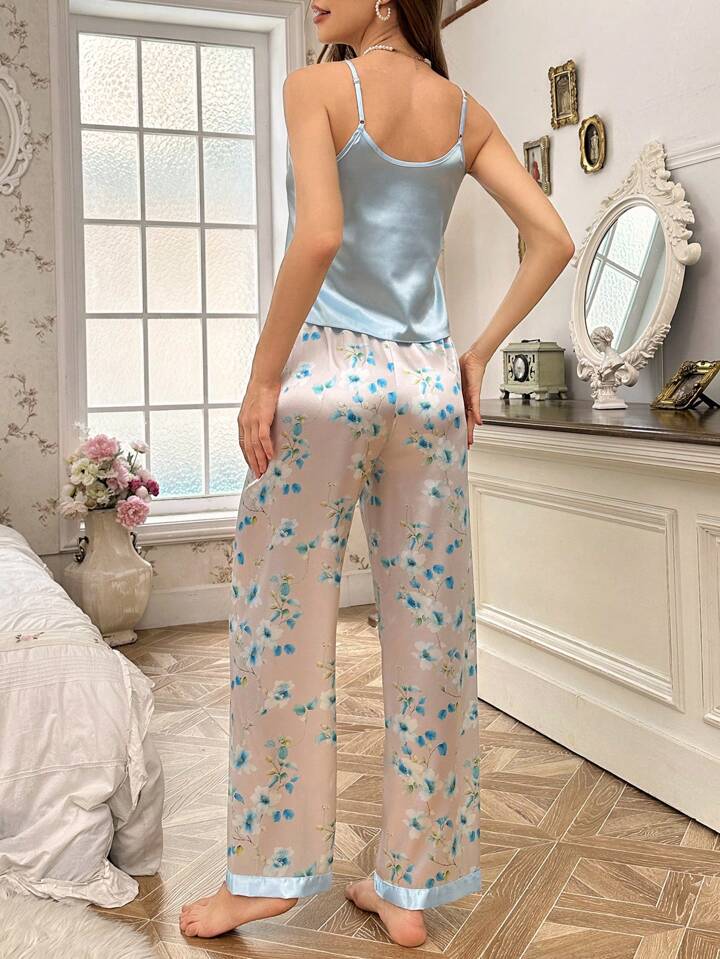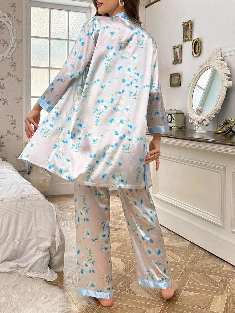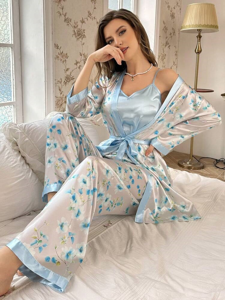 floral print, cami top, pants, belted robe, 3 piece, satin pj set for women